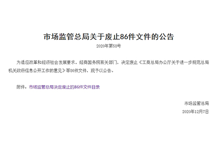 12月7日,市場監管總局發布關于廢止86件文件的2020年第58號公告,為適應改革和經濟社會發展要求,經商國務院有關部門,決定廢止《工商總局辦公廳關于進一步規范總局機關政府信息公開工作的意見》等86件文件