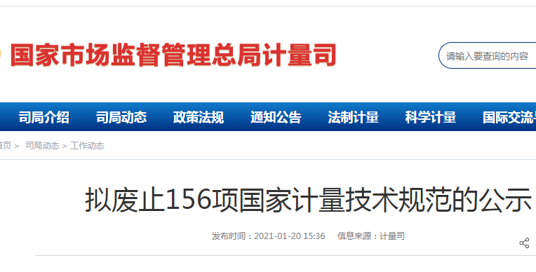參照《國家計量檢定規程管理辦法》有關規定,2020年,市場監管總局組織對1995項國家計量技術規范進行了集中復審,根據復審結論,擬對其中156項國家計量技術規范(見附件)按程序廢止。
