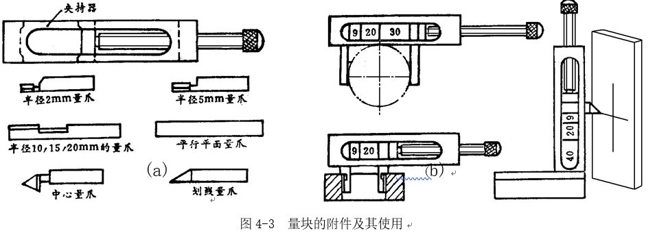 為了擴大量塊的應用范圍,便于各種測量工作,可采用成套的量塊附件。量塊附件中,主要的是不同長度的夾持器和各種測量用的量腳,如圖4-3(a)所示。量塊組與量塊附件裝置后,可用作校準量具尺寸(如內徑百分尺的校準),測量軸徑、孔徑、高度和劃線等工作,如圖4-3(b)所示。