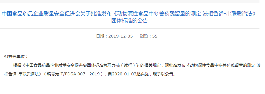 近日,中國食品藥品企業(yè)質(zhì)量安全促進會發(fā)布了關(guān)于《動物源性食品中多獸藥殘留量的測定 液相色譜-串聯(lián)質(zhì)譜法》團體標準的公告。公告中稱,該標準將于2020年1月3號正式實施。