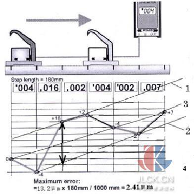 因為水平儀的工作原理,每一個讀數都實際代表了該段步距的斜率。又因為是連續測量,所以后一段的起點即為前一段的終點,將各測點的讀數值逐點累積標在直角坐標系上,連接各坐標點成一折線,這實際上就是被測直線的數學模型線。得到圖表1中下方的波形圖,按最小條件(縱坐標距離最小)作兩條平行線,如圖1中線條1、2,將數學模型線完全夾住,此對平行線間的區域即為最小包容區域,兩條平行線之間的縱向距離,就是直線度誤差值)。