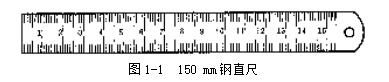 鋼直尺是最簡單的長度量具,它的長度有150,300,500和1000 mm四種規(guī)格。圖1-1是常用的150 mm鋼直尺。