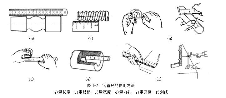 鋼直尺用于測量零件的長度尺寸(圖1-2),它的測量結(jié)果不太準確。這是由于鋼直尺的刻線間距為1mm,而刻線本身的寬度就有0.1~0.2mm,所以測量時讀數(shù)誤差比較大,只能讀出毫米數(shù),即它的最小讀數(shù)值為1mm,比1mm小的數(shù)值,只能估計而得。